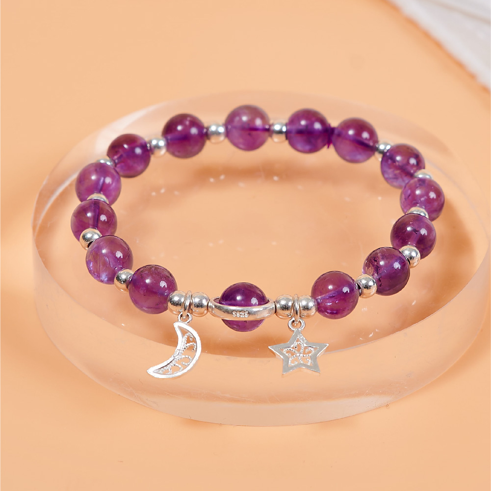 Vòng đá thạch anh tím Trăng Sao này đặc biệt phù hợp với nữ giới, mang lại vẻ đẹp duyên dáng và thanh thoát. Màu tím của thạch anh tím và charm bạc trăng sao tạo nên một tổng thể hài hòa, giúp thu hút tài lộc, may mắn và sự bình an trong cuộc sống.