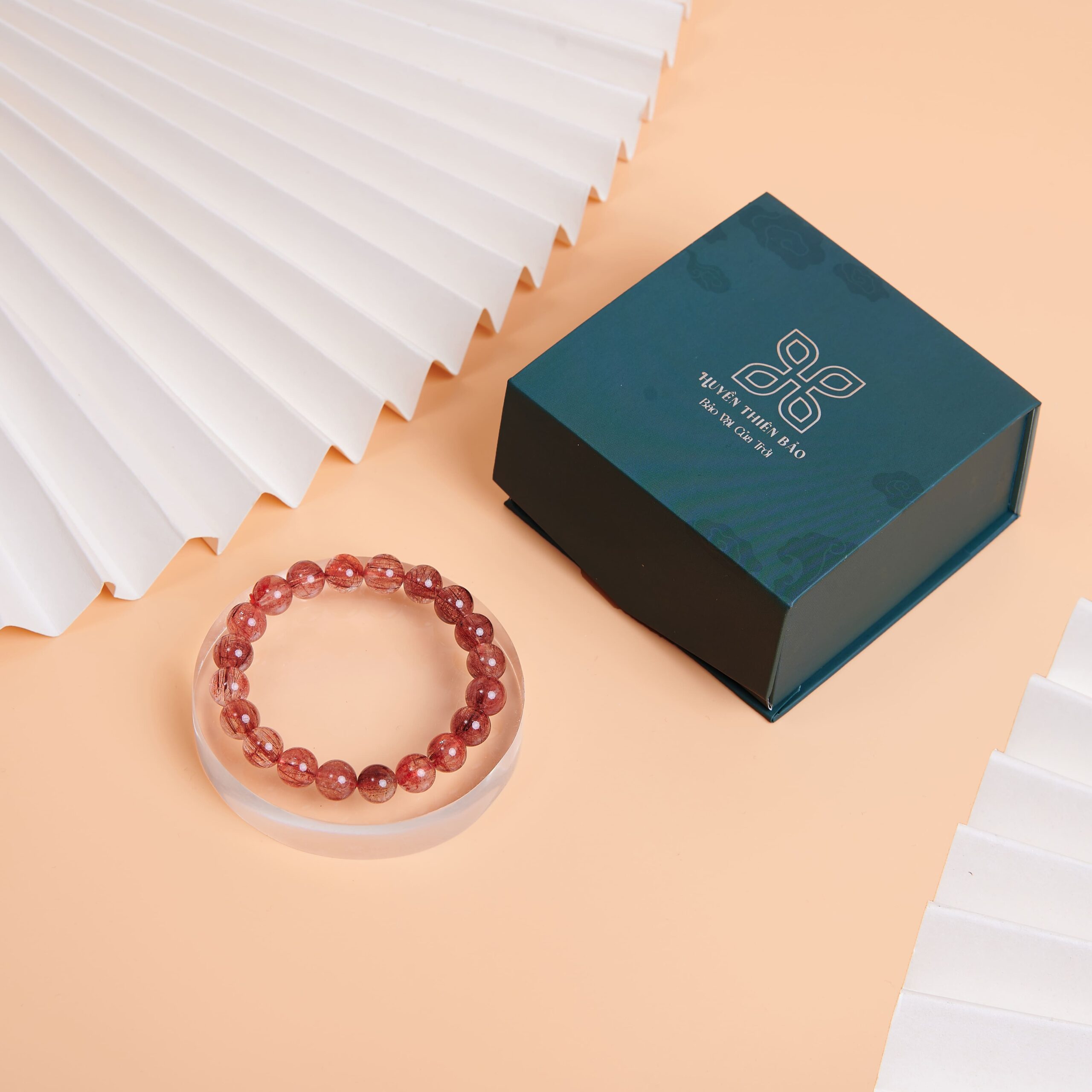 Vòng thạch anh tóc đỏ hạt trơn là một loại trang sức phong thủy độc đáo, được chế tác từ những viên đá thạch anh trắng hoặc hồng nhạt trong suốt, chứa các bao thể Rutile (Titanium Dioxide) có màu đỏ hoặc đỏ cam, tạo nên hình ảnh như những sợi tóc đỏ rực rỡ bên trong viên đá.